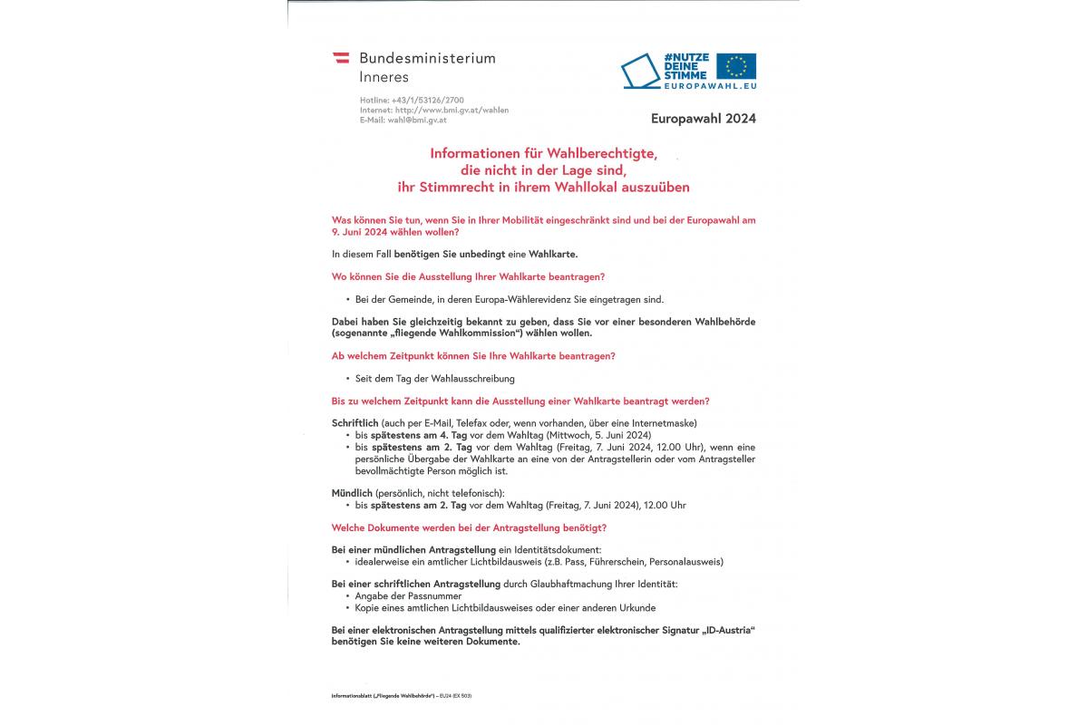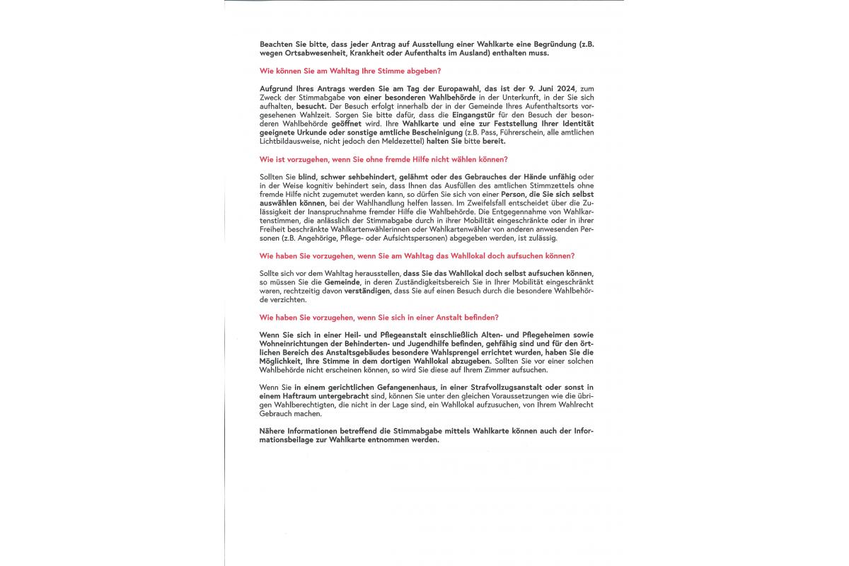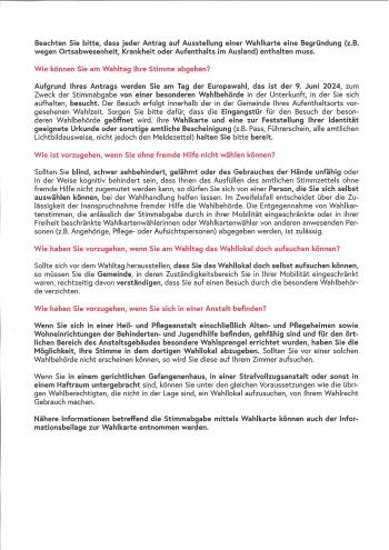 Informationen für Wahlberechtigte, die nicht in der Lage sind, ihr Stimmrecht am 9. Juni 2024 in ihrem Wahllokal auszuüben.